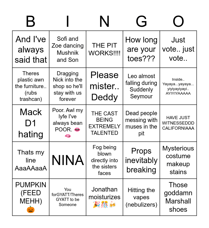 This bingo card has a free space and 24 words: NINA, You forGYATT/Theres GYATT to be Someone, Please mister.. Deddy, PUMPKIN (FEED MEHH) 🎃, Just vote.. just vote.., And I've always said that, Theres plastic awn the furniture.. (rubs trashcan), Sofi and Zoe dancing Mushnik and Son, Dead people messing with muses in the pit, Fog being blown directly into the sisters faces, Leo almost falling during Suddenly Seymour, Mack D1 hating, Props inevitably breaking, Mysterious costume makeup stains, Dragging Nick into the shop so he'll stay with us forever, Hitting the vapes (nebulizers), HAVE JUST WITNESSEDDD CALIFORNIAAA, THE PIT WORKS!!!!, Inside.. Yayaya...yayaya... yiyiyayiyayi.. AYIYIYAAAAA, Poor. Awl my lyfe I've always bean POOR. 👄🫦, Those goddamn Marshall shoes, Thats my line AaaAAaaA, How long are your toes??? and Jonathan moisturizes 🎉🎊🍻.