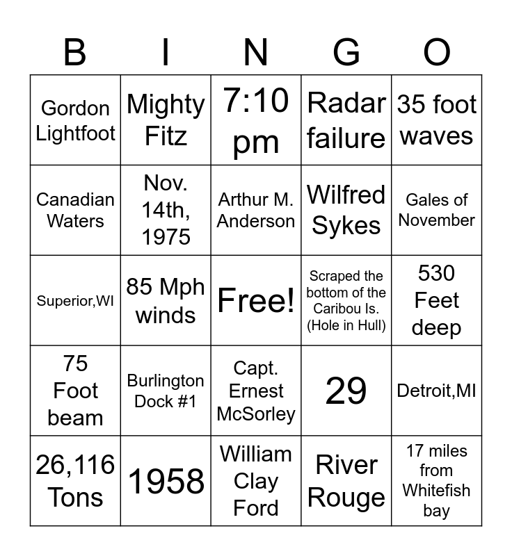 This bingo card has a free space and 39 words: 729 Foot length, Nov. 10th, 1975, Nov. 9th, 1975, Nov. 14th, 1975, 26,116 Tons, Capt. Ernest McSorley, Arthur M. Anderson, Capt. Bernie Cooper, 35 foot waves, 75 Foot beam, 85 Mph winds, Radar failure, 17 miles from Whitefish bay, 530 Feet deep, Scraped the bottom of the Caribou Is. (Hole in Hull), Burlington Dock #1, Gitchee Gumee, Gordon Lightfoot, Taconite pellets, 29, Canadian Waters, William Clay Ford, Wilfred Sykes, Gales of November, Steam turbine engine, 17 years of service, 25 ft draft, 33ft cargo hold depth, Queen of the Lakes, Mighty Fitz, Lake Superior, Soo Locks, 7:10 pm, 1958, River Rouge, Zug Island, Detroit,MI, Superior,WI and Starboard List.