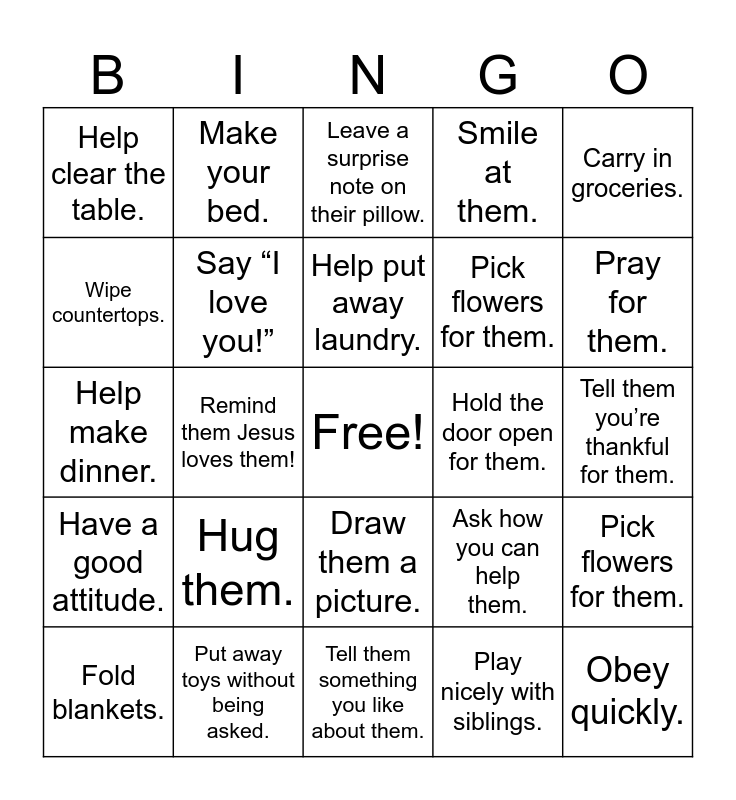 This bingo card has a free space and 24 words: Hug them., Put away toys without being asked., Help put away laundry., Fold blankets., Carry in groceries., Help clear the table., Wipe countertops., Make your bed., Hold the door open for them., Draw them a picture., Pick flowers for them., Help make dinner., Ask how you can help them., Pick flowers for them., Say “I love you!”, Play nicely with siblings., Tell them you’re thankful for them., Leave a surprise note on their pillow., Pray for them., Remind them Jesus loves them!, Obey quickly., Have a good attitude., Smile at them. and Tell them something you like about them..
