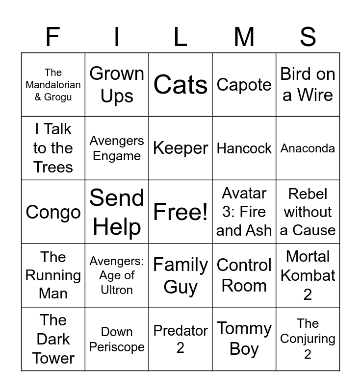 This bingo card has a free space and 64 words: Speed, Fast Five, Reign of Fire, Mortal Kombat 2, The Fugitive, Icefall, Grown Ups, Bram Stoker's Dracula, Keeper, Split, Family Guy, Three Kings, Rebel without a Cause, Bird on a Wire, Little Nicky, I Talk to the Trees, Send Help, The Mandalorian & Grogu, Overboard, Hancock, Avengers: Age of Ultron, The Running Man, Capote, The Outsiders, Altered, Star Trek, Die My Love, Band of Brothers, Indiana Jones & The Temple of Doom, The Good, the Bad, and the Ugly, Greenland 2: Migration, Eterinity, Wyatt Earp, Alien Covenant, Anaconda, The Dark Tower, Apollo 18, Tommy Boy, Apocalypse Now, Avengers Engame, Congo, Avatar 3: Fire and Ash, Nuremberg, Tucker & Dale vs Evil, Death Race, The Conjuring 2, Down Periscope, Conan the Barbarian, Control Room, Sully, Crocodile Dundee, Mercy, Predator 2, Thunderbolts, Outbreak, Sisu 2: Road to Revenge, Cats, Now You See Me Now You Don't, The Beldham, The Rise of Skywalker, Walk the Line, Big Fish, 12 Monkeys and Epic Movie.
