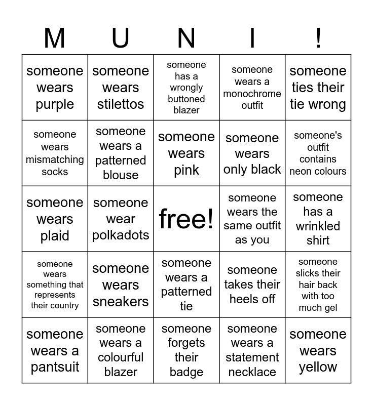 This bingo card has a free space and 24 words: someone wears sneakers, someone wears a colourful blazer, someone wears pink, someone wears a pantsuit, someone ties their tie wrong, someone wears purple, someone wears mismatching socks, someone wears stilettos, someone wears the same outfit as you, someone wears a patterned tie, someone wears only black, someone wears plaid, someone takes their heels off, someone slicks their hair back with too much gel, someone wears a patterned blouse, someone wears a statement necklace, someone has a wrinkled shirt, someone has a wrongly buttoned blazer, someone's outfit contains neon colours, someone wear polkadots, someone wears yellow, someone wears something that represents their country, someone wears a monochrome outfit and someone forgets their badge.