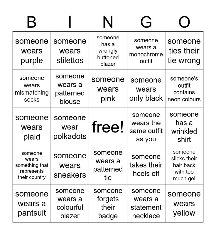 This bingo card has a free space and 24 words: someone wears sneakers, someone wears a colourful blazer, someone wears pink, someone wears a pantsuit, someone ties their tie wrong, someone wears purple, someone wears mismatching socks, someone wears stilettos, someone wears the same outfit as you, someone wears a patterned tie, someone wears only black, someone wears plaid, someone takes their heels off, someone slicks their hair back with too much gel, someone wears a patterned blouse, someone wears a statement necklace, someone has a wrinkled shirt, someone has a wrongly buttoned blazer, someone's outfit contains neon colours, someone wear polkadots, someone wears yellow, someone wears something that represents their country, someone wears a monochrome outfit and someone forgets their badge.
