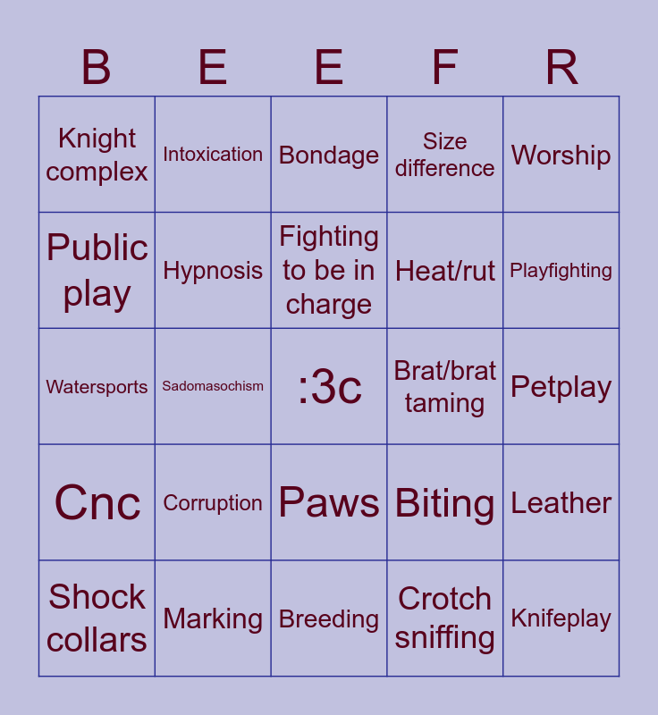 This bingo card has a free space and 24 words: Corruption, Marking, Fighting to be in charge, Shock collars, Worship, Knight complex, Public play, Intoxication, Brat/brat taming, Paws, Heat/rut, Watersports, Biting, Leather, Hypnosis, Crotch sniffing, Petplay, Bondage, Playfighting, Sadomasochism, Knifeplay, Cnc, Size difference and Breeding.
