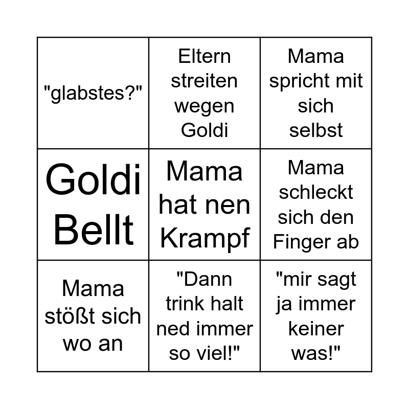 This bingo card has 1 images and 10 words: "mir sagt ja immer keiner was!", "Dann trink halt ned immer so viel!", Mama hat nen Krampf, Mama stößt sich wo an, Eltern streiten wegen Goldi, Mama spricht mit sich selbst, Mama schleckt sich den Finger ab, "Was solln etz des?", Goldi Bellt and "glabstes?".