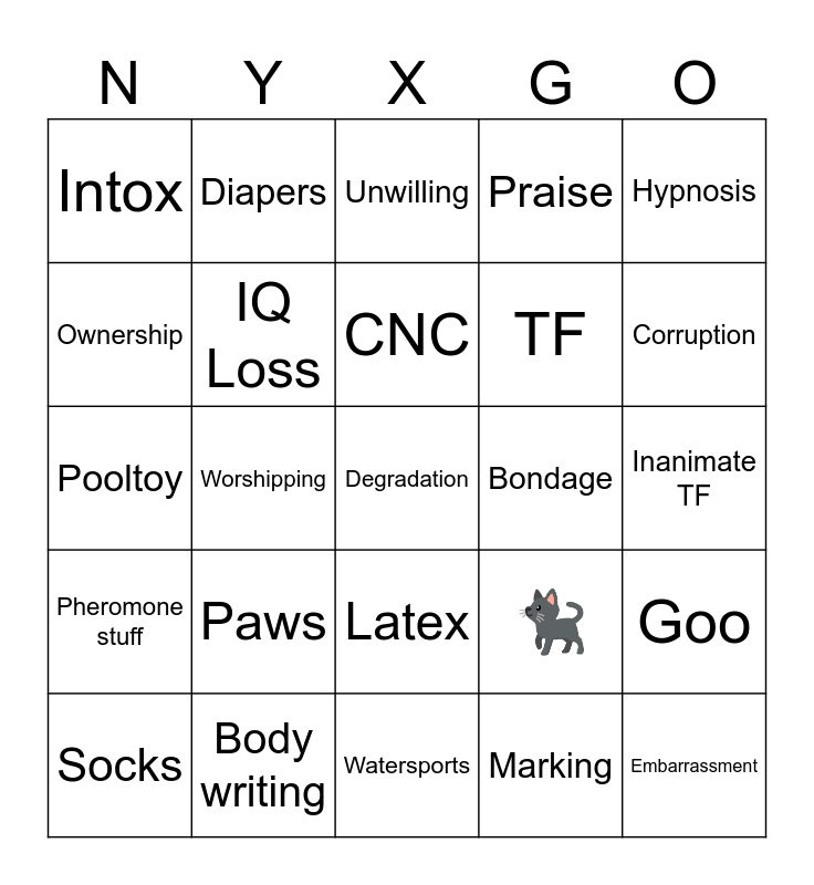 This bingo card has 25 words: Paws, Watersports, CNC, Socks, Hypnosis, Intox, Ownership, Diapers, Bondage, Latex, TF, Pooltoy, 🐈⬛, Goo, IQ Loss, Embarrassment, Inanimate TF, Unwilling, Corruption, Worshipping, Degradation, Body writing, Pheromone stuff, Praise and Marking.