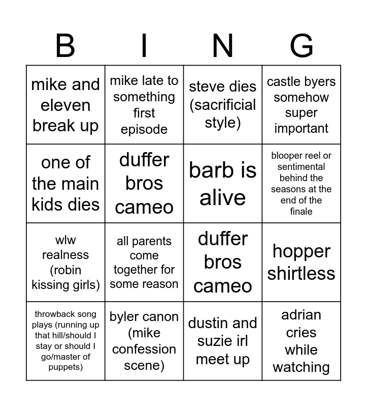 This bingo card has 16 words: byler canon (mike confession scene), hopper shirtless, steve dies (sacrificial style), mike and eleven break up, wlw realness (robin kissing girls), mike late to something first episode, duffer bros cameo, dustin and suzie irl meet up, one of the main kids dies, duffer bros cameo, throwback song plays (running up that hill/should I stay or should I go/master of puppets), castle byers somehow super important, all parents come together for some reason, blooper reel or sentimental behind the seasons at the end of the finale, barb is alive and adrian cries while watching.