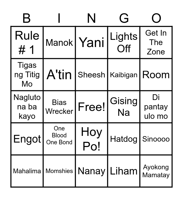 This bingo card has a free space and 39 words: Itlog ni Pablo, BANO, Lolo Mo, A'tin, Mahalima, Hoy Po!, Sheesh, Protect your Belief, Get In The Zone, Engot, Bias Wrecker, Lights Off, Ayokong Mamatay, Di pantay ulo mo, Gising Na, One Blood One Bond, Wifey, Rule # 1, Wag ka na magpaliwanag, Hatdog, Tigas ng Titig Mo, Nanay, Kaibigan, Room, Cullen's Angels, Limbo, October 26, Go Up, Vampire, Manok, Ninang, Ofifi, Yani, Momshies, Liham, Matutunaw din lahat ng Nyebe, Sinoooo, Nagluto na ba kayo and Unpalow esbinayntin.