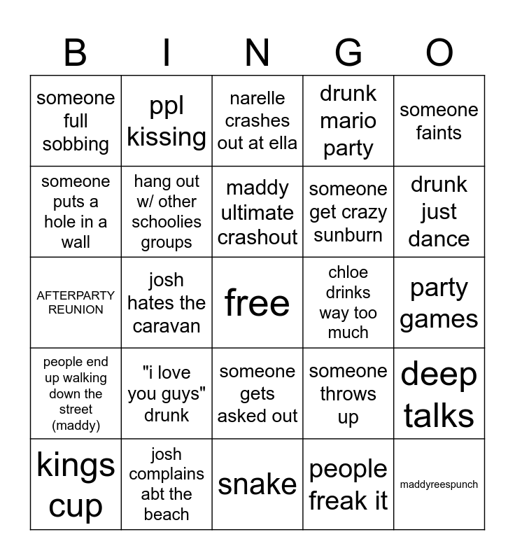 This bingo card has a free space and 24 words: "i love you guys" drunk, josh complains abt the beach, maddy ultimate crashout, kings cup, someone faints, someone full sobbing, someone puts a hole in a wall, ppl kissing, chloe drinks way too much, someone gets asked out, someone get crazy sunburn, AFTERPARTY REUNION, someone throws up, deep talks, hang out w/ other schoolies groups, people freak it, party games, narelle crashes out at ella, drunk just dance, josh hates the caravan, maddyreespunch, people end up walking down the street (maddy), drunk mario party and snake.