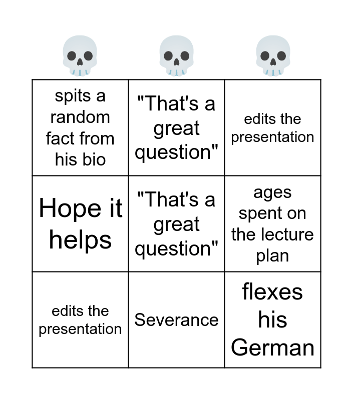 This bingo card has 19 words: flexes his German, ages spent on the lecture plan, edits the presentation, question followed by dead silence, talks about his own research, "That's a great question", "Hope it helps", spits a random fact from his bio, "That's a great question", flexes his German, spits a random fact from his bio, ages spent on the lecture plan, edits the presentation, That's a great question, question followed by dead silence, talks about his own research, Hope it helps, Severance and Squid game.