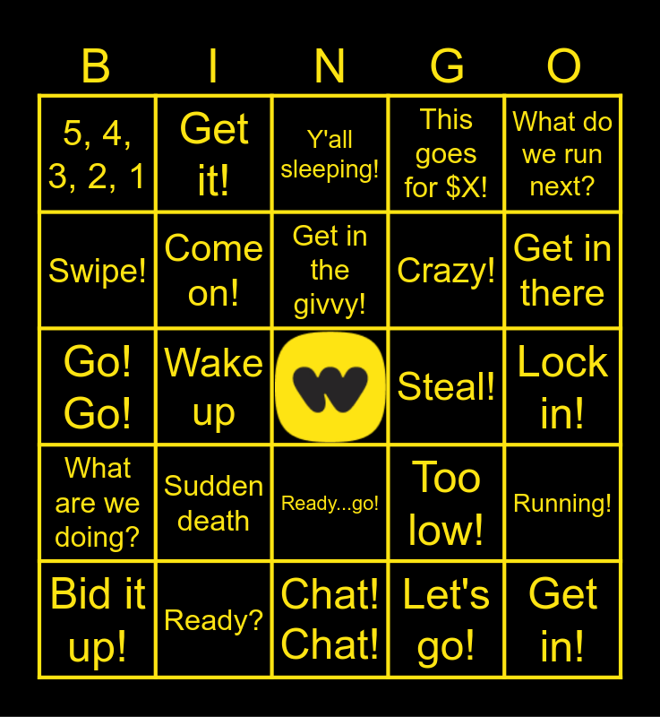 This bingo card has a free space and 24 words: Bid it up!, Sudden death, Get in the givvy!, Let's go!, What do we run next?, 5, 4, 3, 2, 1, Get it!, Y'all sleeping!, Steal!, Lock in!, Go! Go!, Come on!, Too low!, Running!, Swipe!, Ready?, Chat! Chat!, This goes for $X!, Get in there, What are we doing?, Wake up, Ready...go!, Crazy! and Get in!.
