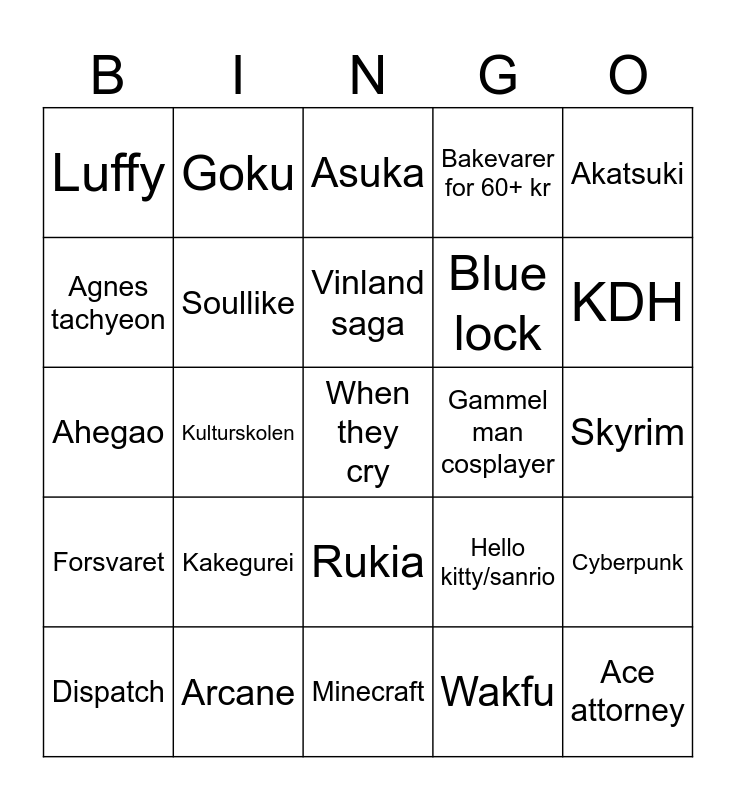 This bingo card has a free space and 24 words: Kakegurei, Arcane, Vinland saga, Dispatch, Akatsuki, Luffy, Agnes tachyeon, Goku, Gammel man cosplayer, Rukia, Blue lock, Ahegao, Hello kitty/sanrio, Cyberpunk, Soullike, Wakfu, Skyrim, Asuka, KDH, Kulturskolen, Ace attorney, Forsvaret, Bakevarer for 60+ kr and Minecraft.