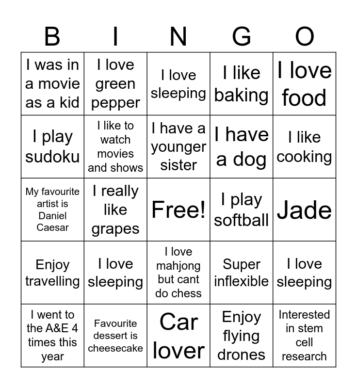 This bingo card has a free space and 63 words: I like biscuits, I like travelling, I have 2 giant tortoises and a dog, I love sleeping, I like playing basketball and volleyball, I've seen the lego movie over 20x, I love green pepper, I like to make Memojis, I have a younger sister, I like pho, I love mahjong but cant do chess, I have a 1157 day duolingo streak, Jade, I love food, I like good people, I play sudoku, I really like grapes, I was in a movie as a kid, I like cashews, I have a dog, I love sleeping, Enjoy travelling, I like baking, I can speak 4 languages fluently, I have a cat called Bongo, I dance, I am an only child!, I really like dinosaurs, I’ve explored drone photography, I like hanging out with my friends, I never wake up later than 10.00 am, I’ve studied at 2 secondary/ high schools, I love making new friends!!!, I have 2 cats, I like cooking, I went to the A&E 4 times this year, I liked chemistry more than biology in high school before uni chemistry destroyed me, Enjoy flying drones, I thought I could travel in time and see the future after experiencing deja vu for the first time in fourth grade, I like to watch movies and shows, My favourite artist is Daniel Caesar, I play softball, Fell off a cliff in Sai Kung, My favourite TV show is gossip girl, Interested in stem cell research, Favourite dessert is cheesecake, Sodium, Super inflexible, Living alone since 18, Enjoy going cafe hopping, Gold, Car lover, Bowling, My main sport in uni was ultimate frisbee, All the pets I've had are named after chocolate brands, I love sleeping, Has 2 siblings, Travelling, I drank absinthe before which is 70% alcohol!, Took a flight on the same day, Love movies, Tennis and Trying to start watching football.