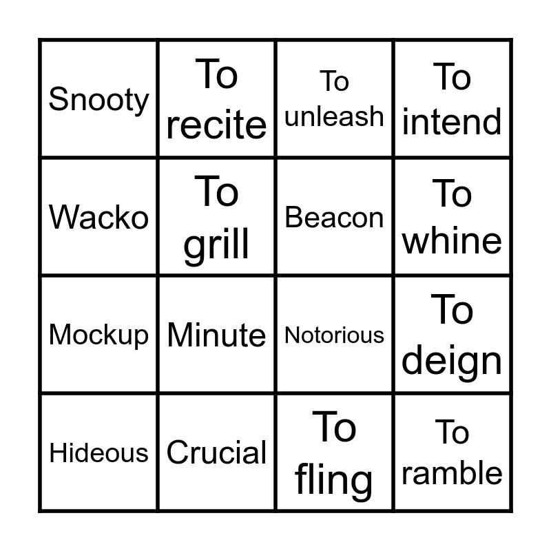 This bingo card has 16 words: Crucial, To deign, To unleash, Snooty, Mockup, To recite, Notorious, To fling, Wacko, To grill, Hideous, To intend, Minute, To whine, Beacon and To ramble.