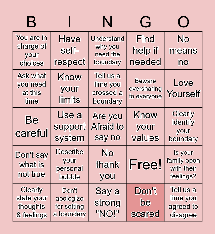 This bingo card has 25 words: Describe your personal bubble, Say a strong "NO!", Tell us a time you crossed a boundary, Clearly state your thoughts & feelings, No means no, You are in charge of your choices, Ask what you need at this time, Have self-respect, Know your values, No thank you, Beware oversharing to everyone, Be careful, Free!, Is your family open with their feelings?, Know your limits, Tell us a time you agreed to disagree, Clearly identify your boundary, Understand why you need the boundary, Love Yourself, Use a support system, Are you Afraid to say no, Don't apologize for setting a boundary, Don't say what is not true, Find help if needed and Don't be scared.