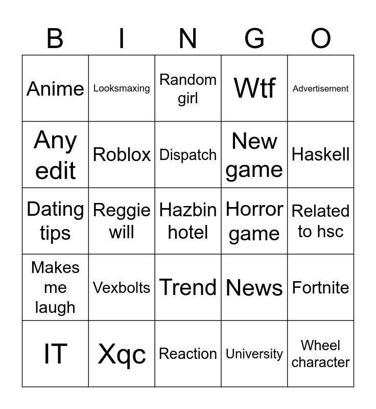 This bingo card has a free space and 24 words: Vexbolts, Xqc, Dispatch, IT, Advertisement, Anime, Any edit, Looksmaxing, Horror game, Trend, New game, Dating tips, News, Fortnite, Roblox, University, Related to hsc, Random girl, Haskell, Reggie will, Wheel character, Makes me laugh, Wtf and Reaction.