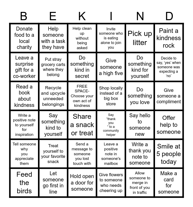 This bingo card has 36 words: Leave a positive note in someone's mailbox, Send a message to someone you lost touch with, Give flowers to someone who needs cheering up, Leave a surprise gift for a co-worker, Write a positive note to yourself for inspiration, Shop locally instead of a big box store, Put stray grocery carts where they belong, Hold open a door for someone, Pick up litter, Write a thank you note to someone, Decide to say, ‘yes’ when someone was expecting a ‘no’, Invite someone who is eating alone to join you, Smile at 5 people today, Recycle and upcycle unneeded belongings, Give someone a high five, Donate food to a local charity, Tell someone why you appreciate them, Do something you love, Read a book about kindness, Help clean up without being asked, FREE SPACE- Choose your own act of kindness, Say something kind to yourself, Say “thank you ” to a community helper, Share a snack or treat, Say hello to someone new, Help someone with a task they have, Do something kind for yourself, Let someone go first in line, Do something kind in secret, Paint a kindness rock, Make a card for someone, Feed the birds, Offer help to someone, Give someone a compliment, Treat yourself to your favorite snack and Allow someone to merge in front of you in traffic.