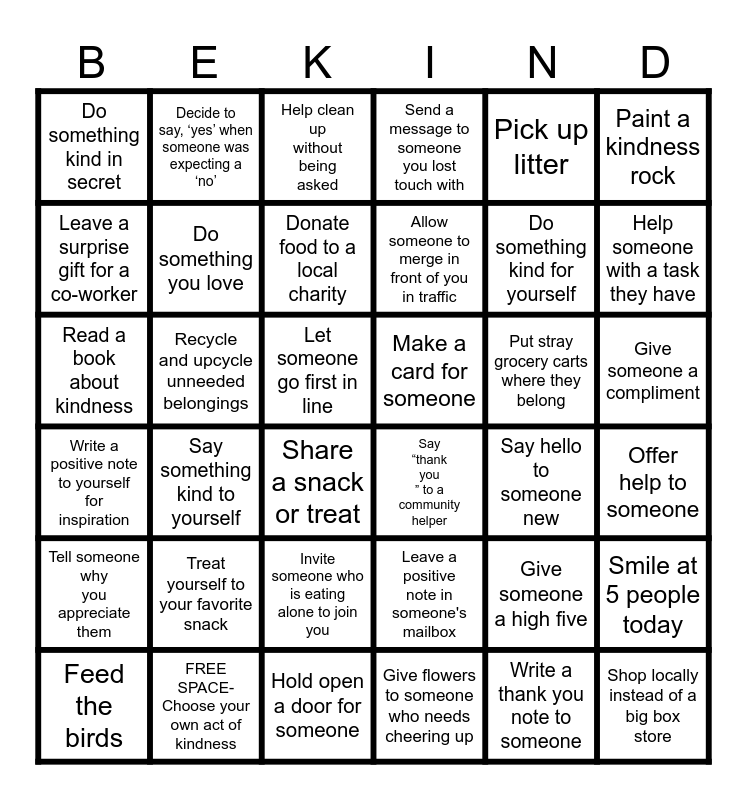 This bingo card has 36 words: Leave a positive note in someone's mailbox, Invite someone who is eating alone to join you, Give flowers to someone who needs cheering up, Leave a surprise gift for a co-worker, Write a positive note to yourself for inspiration, Make a card for someone, Do something you love, Hold open a door for someone, Pick up litter, Give someone a high five, Help someone with a task they have, Send a message to someone you lost touch with, Smile at 5 people today, Recycle and upcycle unneeded belongings, Allow someone to merge in front of you in traffic, Do something kind in secret, Tell someone why you appreciate them, Put stray grocery carts where they belong, Read a book about kindness, Help clean up without being asked, Let someone go first in line, Say something kind to yourself, Say “thank you ” to a community helper, Share a snack or treat, Say hello to someone new, Decide to say, ‘yes’ when someone was expecting a ‘no’, Do something kind for yourself, FREE SPACE- Choose your own act of kindness, Donate food to a local charity, Paint a kindness rock, Shop locally instead of a big box store, Feed the birds, Offer help to someone, Give someone a compliment, Treat yourself to your favorite snack and Write a thank you note to someone.