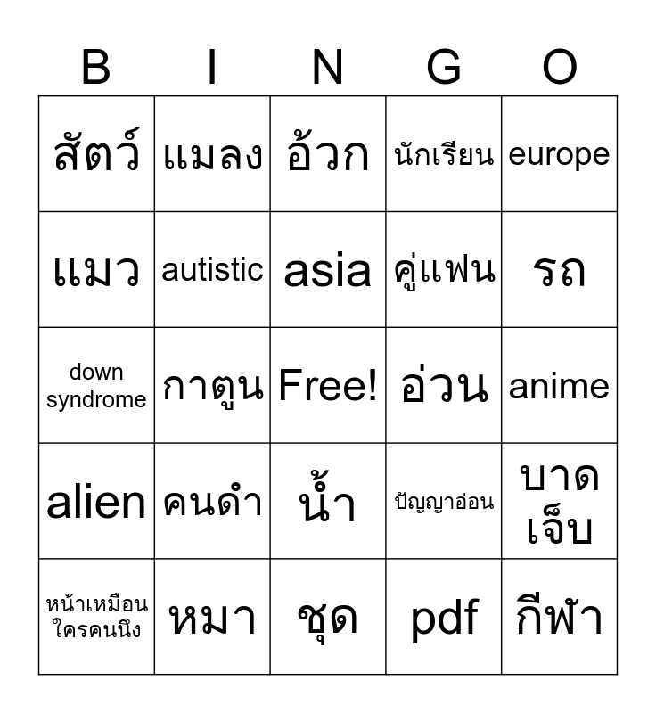 This bingo card has a free space and 24 words: หน้าเหมือนใครคนนึง, คนดำ, asia, pdf, europe, สัตว์, แมลง, อ้วก, อ่วน, anime, down syndrome, autistic, ปัญญาอ่อน, บาดเจ็บ, แมว, หมา, ชุด, นักเรียน, รถ, alien, กาตูน, นํ้า, คู่แฟน and กีฬา.