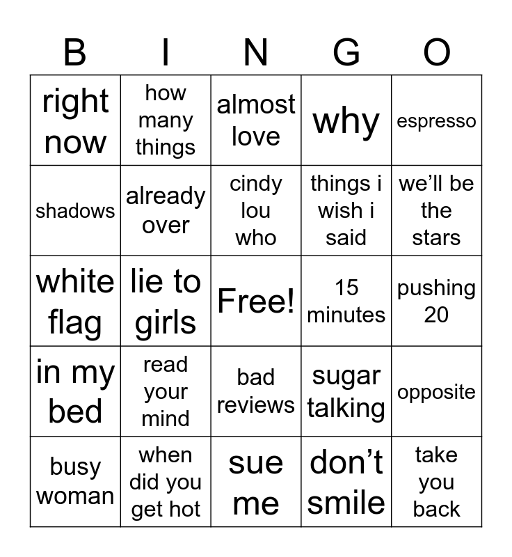 This bingo card has a free space and 79 words: manchild, mirage, almost love, bed chem, coincidence, emails i can’t send, eyes wide open, on purpose, mona lisa, bet u wanna, looking at me, paris, why, right now, sharpest tool, shadows, vicious, read your mind, skin, pushing 20, prfct, espresso, white flag, cindy lou who, already over, don’t want it back, bad time, can’t blame a girl for trying, because i liked a boy, thumbs, we’ll be the stars, smoke and fire, sue me, please please please, busy woman, 15 minutes, too young, alien, diamonds are forever, take you back, taste, couldn’t make it any harder, tell em, hold tight, exhale, how many things, honeymoon fades, nonsense, decode, a nonsense christmas, opposite, lie to girls, sugar talking, juno, lonesome, tornado warnings, dumb & poetic, nobody’s son, good graces, bad reviews, things i wish i said, go go juice, skinny dipping, run and hide, two young hearts, i’m fakin, house tour, white xmas, bad for business, in my bed, when did you get hot, feels like loneliness, goodbye, slim pickins, fast times, don’t smile, take off your cool, feather and no words.