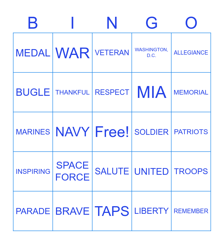 This bingo card has a free space and 59 words: COURAGE, BRAVE, COMMITMENT, INSPIRING, LIBERTY, VALOR, THANKFUL, POPPY, MIA, KIA, WASHINGTON, D.C., SUPPORT, BUGLE, DOG TAGS, WELCOME HOME!, MEDAL, REMEMBER, ALLEGIANCE, JUSTICE, RESPECT, SOLDIER, VETERAN, PARADE, TROOPS, TRIBUTE, ENLISTED, PROTECT, NOVEMBER, MEMORIAL, SAILORS, SAFE, SECURE, PEACE, PRAYER, WAR, FLAG, ARMY, NAVY, AIR FORCE, MARINES, COAST GUARD, SPACE FORCE, PATRIOTS, RED, WHITE, BLUE, AMERICAN PRIDE, SACRIFICE, SALUTE, TAPS, SERVICE, MILITARY, FREEDOM, TRIUMPH, NATION, UNITED, HERO, GRATEFUL and BLESSED.