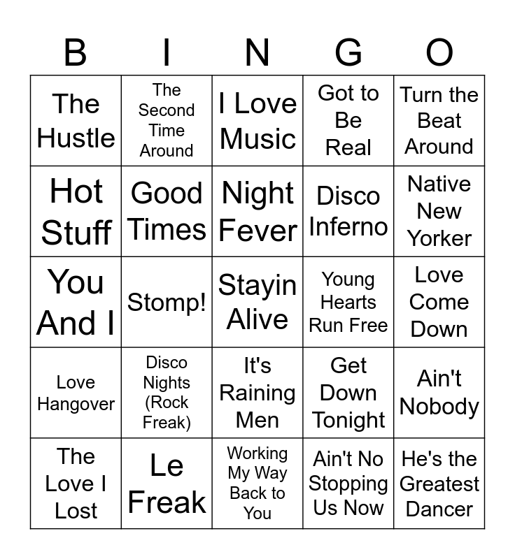 This bingo card has 61 words: Free!, Le Freak, Last Dance, Love Hangover, Ain't No Stopping Us Now, Don't Leave Me This Way, Good Times, Bad Girls, Disco Inferno, You Make Me Feel (Mighty Real), Got to Be Real, Upside Down, Hot Stuff, Boogie Wonderland (with The Emotions), I Will Survive, The Hustle, Stayin Alive, Turn the Beat Around, Ladies Night, Night Fever, Young Hearts Run Free, I Love Music, The Love I Lost, Ain't Nobody, And the Beat Goes On, Car Wash, Heaven Must Be Missing An Angel, Funkytown, Native New Yorker, Boogie Nights, Got To Give It Up, Love Train, Play That Funky Music, Pick Up the Pieces, The Second Time Around, On The Radio, Best of My Love, Stomp!, Rock the Boat, You And I, Shake Your Groove Thing, Disco Nights (Rock Freak), Love Come Down, For the Love of Money, Get Down Tonight, Knock On Wood, Pull Up To The Bumper, Celebration, Love Rollercoaster, It's Raining Men, Working My Way Back to You, The Groove Line, It's a Love Thing, Workin' Day and Night, Fantasy, Fly Robin Fly, Get Up and Boogie - That's Right, I Love The Nightlife (Disco 'Round), Get Off, He's the Greatest Dancer and It Only Takes A Minute.