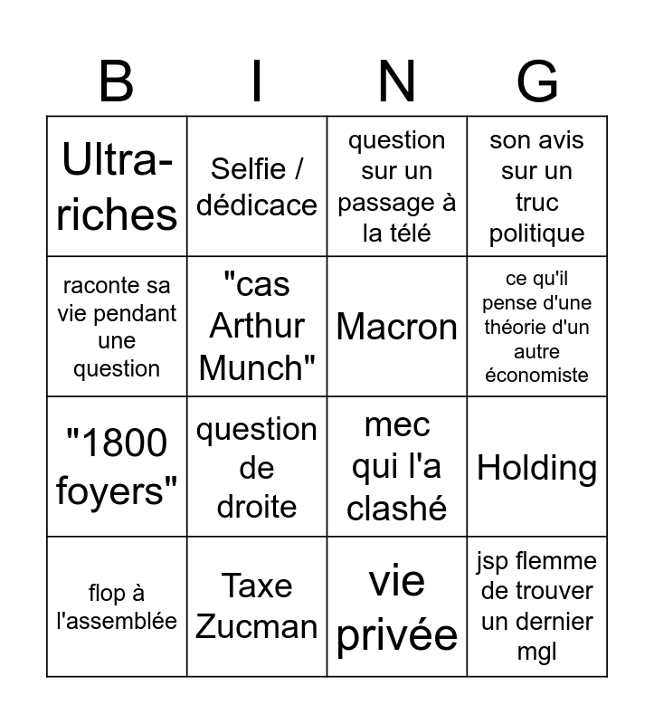 This bingo card has 16 words: Taxe Zucman, Holding, question sur un passage à la télé, Ultra-riches, "1800 foyers", Selfie / dédicace, mec qui l'a clashé, vie privée, raconte sa vie pendant une question, "cas Arthur Munch", flop à l'assemblée, son avis sur un truc politique, question de droite, ce qu'il pense d'une théorie d'un autre économiste, Macron and jsp flemme de trouver un dernier mgl.