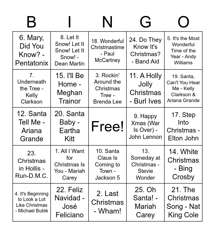 This bingo card has a free space and 25 words: 1. All I Want for Christmas Is You - Mariah Carey, 2. Last Christmas - Wham!, 3. Rockin' Around the Christmas Tree - Brenda Lee, 4. It's Beginning to Look a Lot Like Christmas - Michael Bublé, 5. It's the Most Wonderful Time of the Year - Andy Williams, 6. Mary, Did You Know? - Pentatonix, 7. Underneath the Tree - Kelly Clarkson, 8. Let It Snow! Let It Snow! Let It Snow! - Dean Martin, 9. Happy Xmas (War Is Over) - John Lennon, 10. Santa Claus Is Coming to Town - Jackson 5, 11. A Holly Jolly Christmas - Burl Ives, 12. Santa Tell Me - Ariana Grande, 13. Someday at Christmas - Stevie Wonder, 14. White Christmas - Bing Crosby, 15. I'll Be Home - Meghan Trainor, 16. Sleigh Ride - The Ronettes, 17. Step Into Christmas - Elton John, 18. Wonderful Christmastime - Paul McCartney, 19. Santa, Can't You Hear Me - Kelly Clarkson & Ariana Grande, 20. Santa Baby - Eartha Kitt, 21. The Christmas Song - Nat King Cole, 22. Feliz Navidad - José Feliciano, 23. Christmas in Hollis - Run-D.M.C., 24. Do They Know It's Christmas? - Band Aid and 25. Oh Santa! - Mariah Carey.