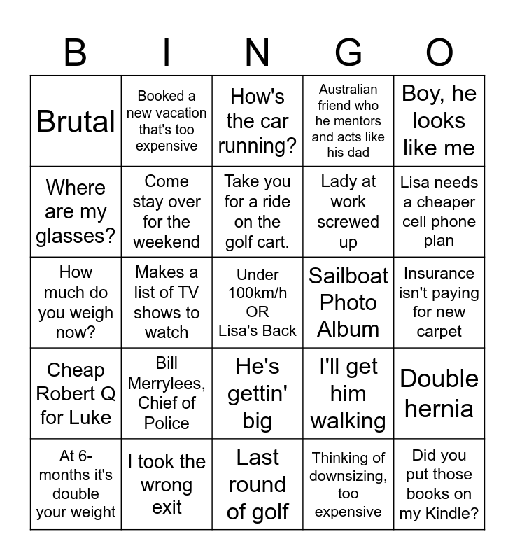 This bingo card has a free space and 24 words: Bill Merrylees, Chief of Police, I took the wrong exit, Take you for a ride on the golf cart., At 6-months it's double your weight, Boy, he looks like me, Brutal, Where are my glasses?, Booked a new vacation that's too expensive, Sailboat Photo Album, He's gettin' big, Lady at work screwed up, How much do you weigh now?, I'll get him walking, Double hernia, Come stay over for the weekend, Thinking of downsizing, too expensive, Insurance isn't paying for new carpet, How's the car running?, Lisa needs a cheaper cell phone plan, Makes a list of TV shows to watch, Did you put those books on my Kindle?, Cheap Robert Q for Luke, Australian friend who he mentors and acts like his dad and Last round of golf.
