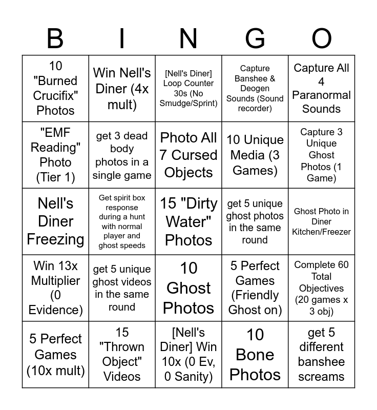 This bingo card has 26 words: 10 Ghost Photos, 10 Bone Photos, Photo All 7 Cursed Objects, 15 "Thrown Object" Videos, Capture All 4 Paranormal Sounds, 10 "Burned Crucifix" Photos, "EMF Reading" Photo (Tier 1), Win Nell's Diner (4x mult), Ghost Photo in Diner Kitchen/Freezer, 5 Perfect Games (Friendly Ghost on), 10 Unique Media (3 Games), Nell's Diner Freezing, Complete 60 Total Objectives (20 games x 3 obj), 5 Perfect Games (10x mult), Get spirit box response during a hunt with normal player and ghost speeds, Get UV on an exit door, Capture Banshee & Deogen Sounds (Sound recorder), Win 13x Multiplier (0 Evidence), [Nell's Diner] Loop Counter 30s (No Smudge/Sprint), 15 "Dirty Water" Photos, Capture 3 Unique Ghost Photos (1 Game), [Nell's Diner] Win 10x (0 Ev, 0 Sanity), get 5 unique ghost photos in the same round, get 5 unique ghost videos in the same round, get 3 dead body photos in a single game and get 5 different banshee screams.