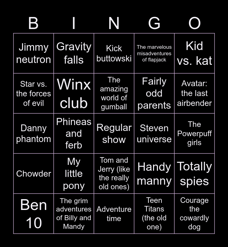 This bingo card has 25 words: My little pony, Adventure time, The amazing world of gumball, Ben 10, Kid vs. kat, Jimmy neutron, Star vs. the forces of evil, Gravity falls, Steven universe, Tom and Jerry (like the really old ones), Fairly odd parents, Danny phantom, Handy manny, Totally spies, Winx club, Courage the cowardly dog, The Powerpuff girls, Kick buttowski, Avatar: the last airbender, Phineas and ferb, Regular show, The grim adventures of Billy and Mandy, Chowder, The marvelous misadventures of flapjack and Teen Titans (the old one).