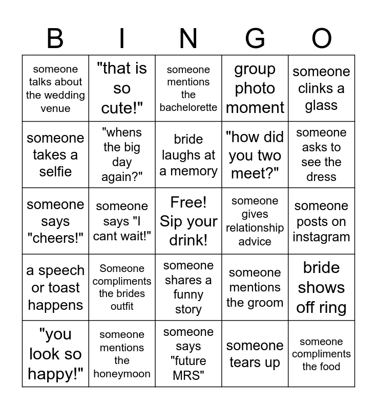 This bingo card has a free space and 24 words: Someone compliments the brides outfit, someone mentions the honeymoon, bride laughs at a memory, "you look so happy!", someone clinks a glass, someone talks about the wedding venue, someone takes a selfie, "that is so cute!", someone gives relationship advice, someone shares a funny story, "how did you two meet?", someone says "cheers!", someone mentions the groom, bride shows off ring, "whens the big day again?", someone tears up, someone posts on instagram, someone mentions the bachelorette, someone asks to see the dress, someone says "I cant wait!", someone compliments the food, a speech or toast happens, group photo moment and someone says "future MRS".