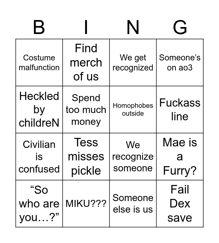 This bingo card has 16 words: MIKU???, Mae is a Furry?, We get recognized, Costume malfunction, Civilian is confused, Find merch of us, We recognize someone, Someone else is us, Heckled by childreN, Spend too much money, “So who are you…?”, Someone’s on ao3, Tess misses pickle, Fuckass line, Homophobes outside and Fail Dex save.