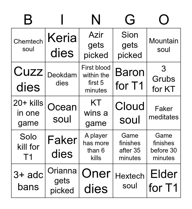 This bingo card has 52 words: T1 wins a game, KT wins a game, Doran dies, Oner dies, Faker dies, Gumayusi dies, Keria dies, PerfecT dies, Cuzz dies, Bdd dies, Deokdam dies, Peter dies, Game finishes before 30 minutes, Game finishes after 35 minutes, First blood for T1, First blood for KT, First blood within the first 5 minutes, Cloud soul, Infernal soul, Mountain soul, Ocean soul, Hextech soul, Chemtech soul, Baron for T1, Baron for KT, Elder for T1, Elder for KT, 3 Grubs for T1, 3 Grubs for KT, T1 wins teamfight, KT wins teamfight, Sion gets picked, Poppy gets picked, Xin Zhao gets picked, Qiyana gets picked, Azir gets picked, Orianna gets picked, Yunara gets picked, Kai'Sa gets picked, Neeko gets picked, Alistar gets picked, Faker meditates, Solo kill for T1, Solo kill for KT, A player has more than 6 kills, A player has more than 5 deaths, An objective is stolen, 20+ kills in one game, A fight happens right after a replay, 3+ mid bans, 3+ adc bans and A team loses after having a 3k+ gold lead.