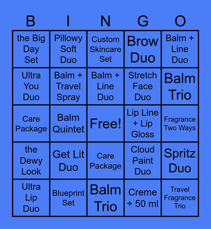 This bingo card has a free space and 29 words: Ultra Lip Duo, Balm Trio, Balm Quintet, Lash Slick Duo, the Big Day Set, Custom Skincare Set, Balm + Travel Spray, Get Lit Duo, Lip Line + Lip Gloss, Blueprint Set, Fragrance Two Ways, Travel Fragrance Trio, Balm Trio, Creme + 50 ml, Balm Trio, Fragrance Two Ways, Care Package, the Dewy Look, Balm + Line Duo, Care Package, Cloud Paint Duo, Balm Quintet, Stretch Face Duo, Ultra You Duo, Brow Duo, Pillowy Soft Duo, Spritz Duo, Balm + Line Duo and Blueprint Set.
