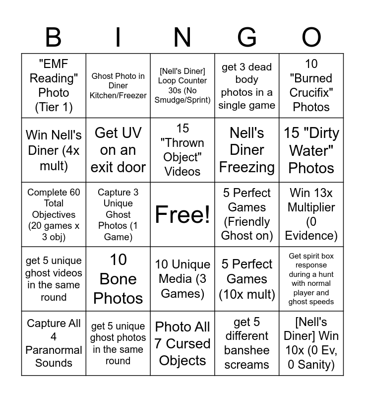 This bingo card has a free space and 25 words: 10 Bone Photos, Photo All 7 Cursed Objects, 15 "Thrown Object" Videos, Capture All 4 Paranormal Sounds, 10 "Burned Crucifix" Photos, "EMF Reading" Photo (Tier 1), Win Nell's Diner (4x mult), Ghost Photo in Diner Kitchen/Freezer, 5 Perfect Games (Friendly Ghost on), 10 Unique Media (3 Games), Nell's Diner Freezing, Complete 60 Total Objectives (20 games x 3 obj), 5 Perfect Games (10x mult), Get spirit box response during a hunt with normal player and ghost speeds, Get UV on an exit door, Capture Banshee & Deogen Sounds (Sound recorder), Win 13x Multiplier (0 Evidence), [Nell's Diner] Loop Counter 30s (No Smudge/Sprint), 15 "Dirty Water" Photos, Capture 3 Unique Ghost Photos (1 Game), [Nell's Diner] Win 10x (0 Ev, 0 Sanity), get 5 unique ghost photos in the same round, get 5 unique ghost videos in the same round, get 3 dead body photos in a single game and get 5 different banshee screams.