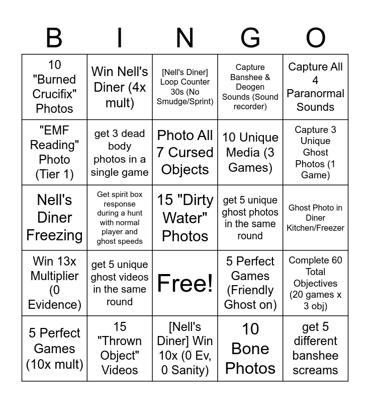 This bingo card has 26 words: Free!, 10 Bone Photos, Photo All 7 Cursed Objects, 15 "Thrown Object" Videos, Capture All 4 Paranormal Sounds, 10 "Burned Crucifix" Photos, "EMF Reading" Photo (Tier 1), Win Nell's Diner (4x mult), Ghost Photo in Diner Kitchen/Freezer, 5 Perfect Games (Friendly Ghost on), 10 Unique Media (3 Games), Nell's Diner Freezing, Complete 60 Total Objectives (20 games x 3 obj), 5 Perfect Games (10x mult), Get spirit box response during a hunt with normal player and ghost speeds, Get UV on an exit door, Capture Banshee & Deogen Sounds (Sound recorder), Win 13x Multiplier (0 Evidence), [Nell's Diner] Loop Counter 30s (No Smudge/Sprint), 15 "Dirty Water" Photos, Capture 3 Unique Ghost Photos (1 Game), [Nell's Diner] Win 10x (0 Ev, 0 Sanity), get 5 unique ghost photos in the same round, get 5 unique ghost videos in the same round, get 3 dead body photos in a single game and get 5 different banshee screams.