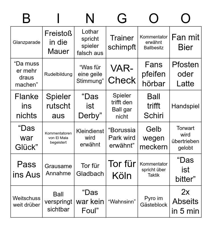 This bingo card has 36 words: Tor für Köln, Tor für Gladbach, “Wahnsinn”, “Da muss er mehr draus machen”, “Das war Glück”, Spieler trifft den Ball gar nicht, Rudelbildung, “Das war kein Foul”, Kommentator erwähnt Ballbesitz, Kommentator spricht über Taktik, Pfosten oder Latte, Trainer schimpft, “Das ist bitter”, Spieler rutscht aus, VAR-Check, Glanzparade, Pass ins Aus, Ball trifft Schiri, Flanke ins nichts, Lothar spricht spieler falsch aus, “Das ist Derby”, Kommentatoren von El Mala begeistert, “Borussia Park wird erwähnt”, Kleindienst wird erwähnt, Gelb wegen meckern, Freistoß in die Mauer, Fans pfeifen hörbar, Ball verspringt sichtbar, “Was für eine geile Stimmung”, Fan mit Bier, 2x Abseits in 5 min, Weitschuss weit drüber, Torwart wird übertrieben gelobt, Handspiel, Grausame Annahme and Pyro im Gästeblock.