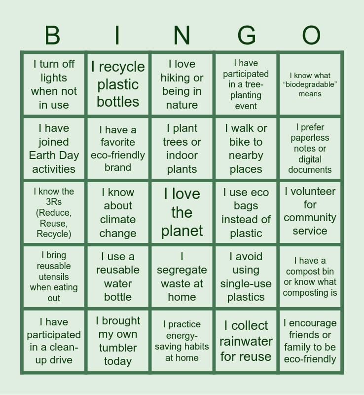 This bingo card has a free space and 24 words: I use a reusable water bottle, I brought my own tumbler today, I plant trees or indoor plants, I have participated in a clean-up drive, I know what “biodegradable” means, I turn off lights when not in use, I have joined Earth Day activities, I recycle plastic bottles, I use eco bags instead of plastic, I segregate waste at home, I walk or bike to nearby places, I know the 3Rs (Reduce, Reuse, Recycle), I avoid using single-use plastics, I have a compost bin or know what composting is, I have a favorite eco-friendly brand, I collect rainwater for reuse, I volunteer for community service, I love hiking or being in nature, I prefer paperless notes or digital documents, I know about climate change, I encourage friends or family to be eco-friendly, I bring reusable utensils when eating out, I have participated in a tree-planting event and I practice energy-saving habits at home.