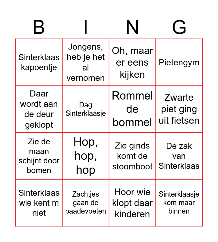 This bingo card has 19 words: Zie ginds komt de stoomboot, Hij komt, hij komt, Oh, maar er eens kijken, Sinterklaasje kom maar binnen, De zak van Sinterklaas, Daar wordt aan de deur geklopt, Hoor wie klopt daar kinderen, Sinterklaas kapoentje, Jongens, heb je het al vernomen, Zie de maan schijnt door bomen, Hop, hop, hop, Dag Sinterklaasje, Rommel de bommel, Zachtjes gaan de paadevoeten, Sinterklaas wie kent m niet, Strooien, strooien strooien, Pietengym, Zwarte piet ging uit fietsen and De pieten sinterklaas move.