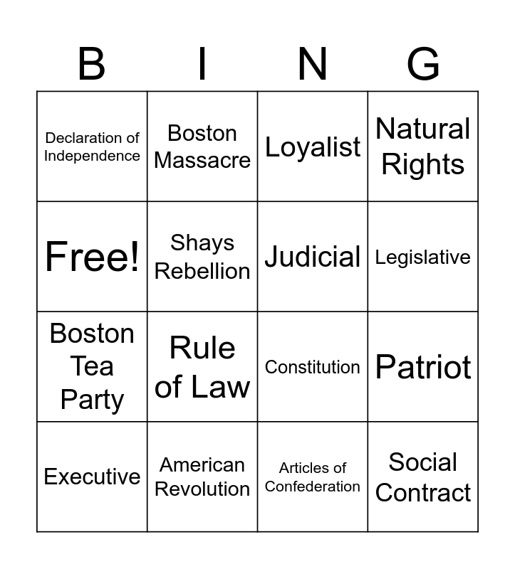 This bingo card has 16 words: American Revolution, Patriot, Loyalist, Declaration of Independence, Boston Tea Party, Boston Massacre, Constitution, Articles of Confederation, Free!, Shays Rebellion, Executive, Natural Rights, Rule of Law, Legislative, Judicial and Social Contract.