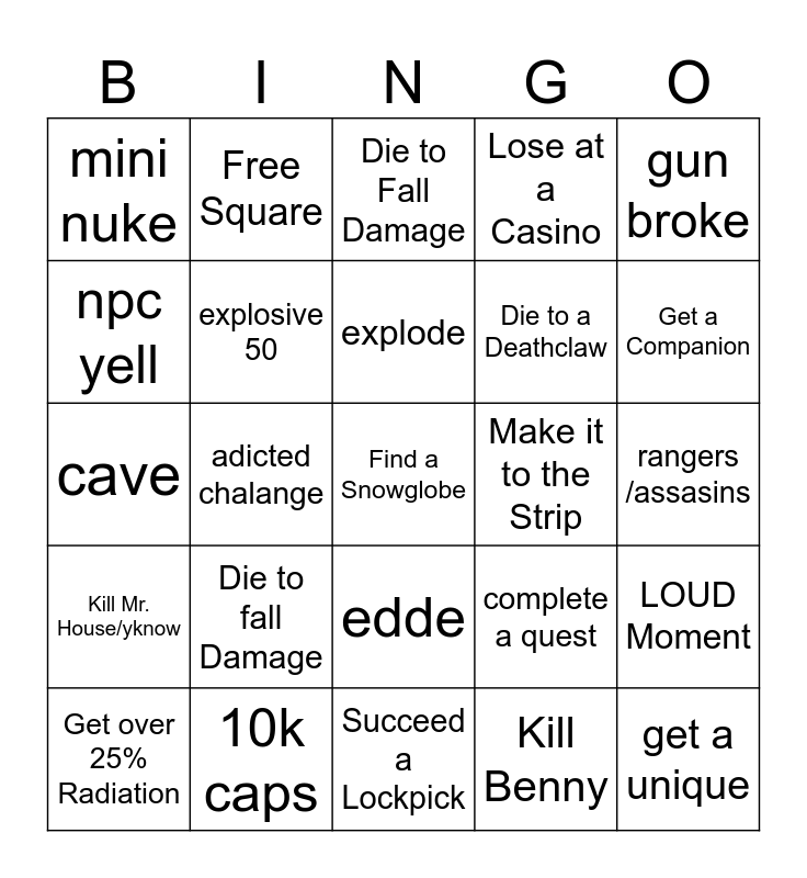 This bingo card has 25 words: Die to fall Damage, Succeed a Lockpick, explode, Get over 25% Radiation, gun broke, mini nuke, npc yell, Free Square, Make it to the Strip, edde, Die to a Deathclaw, cave, complete a quest, LOUD Moment, explosive 50, get a unique, rangers /assasins, Die to Fall Damage, Get a Companion, adicted chalange, Find a Snowglobe, 10k caps, Kill Mr. House/yknow, Lose at a Casino and Kill Benny.