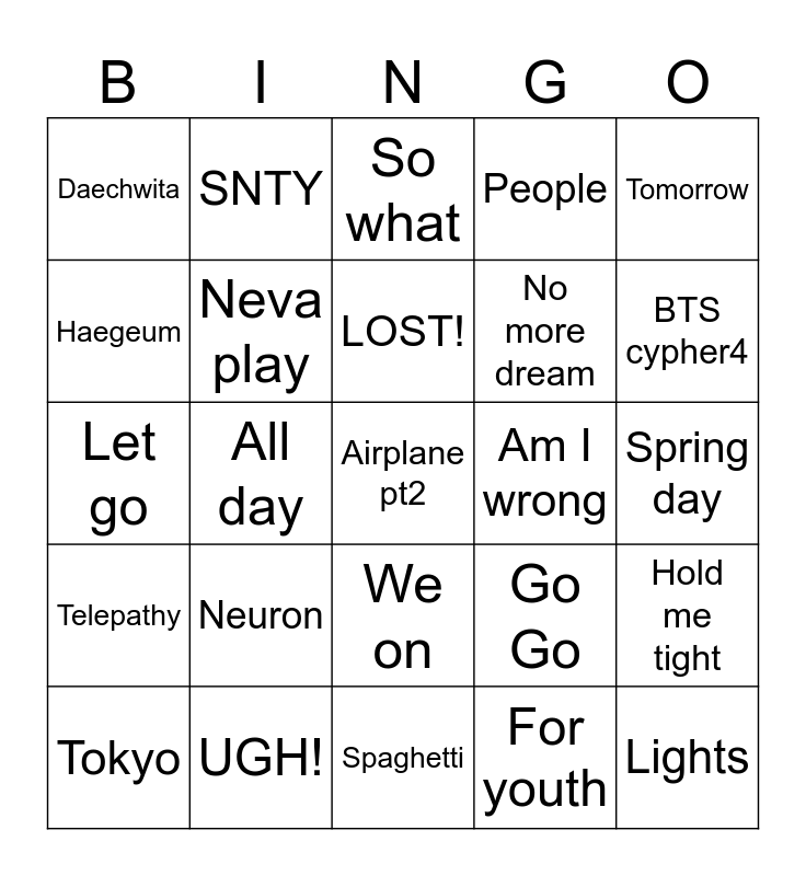 This bingo card has a free space and 24 words: Neuron, UGH!, LOST!, Tokyo, Tomorrow, Daechwita, Haegeum, SNTY, Am I wrong, We on, No more dream, Let go, Go Go, Hold me tight, Neva play, For youth, Spring day, So what, BTS cypher4, All day, Lights, Telepathy, People and Spaghetti.