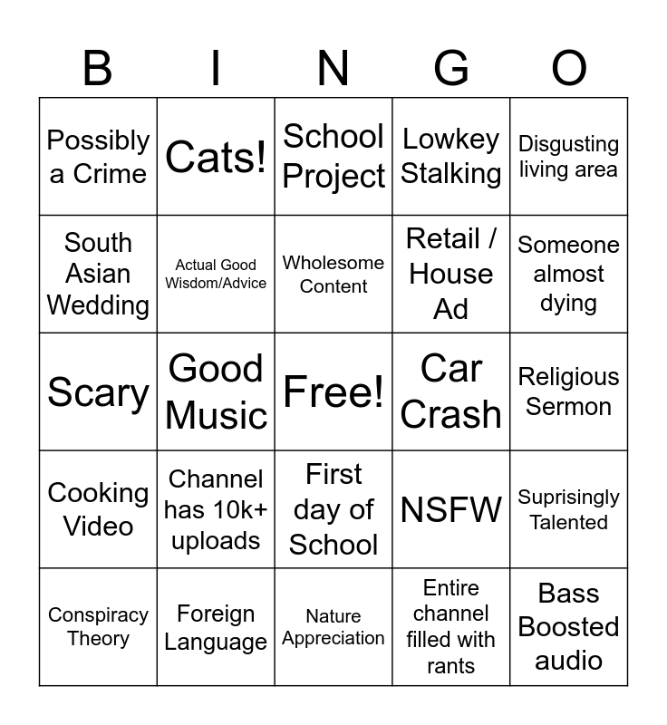 This bingo card has a free space and 24 words: Channel has 10k+ uploads, Foreign Language, Wholesome Content, Conspiracy Theory, Disgusting living area, Possibly a Crime, South Asian Wedding, Cats!, Car Crash, First day of School, Retail / House Ad, Scary, NSFW, Suprisingly Talented, Actual Good Wisdom/Advice, Entire channel filled with rants, Religious Sermon, School Project, Someone almost dying, Good Music, Bass Boosted audio, Cooking Video, Lowkey Stalking and Nature Appreciation.