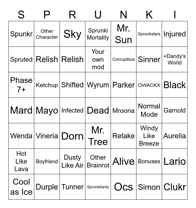This bingo card has 96 words: BenjiXScarlett Brainrot, Pinki, Mroona, +Dandy's World, Jevin, Mr. Bear, Oren, Fun Bot, Sonic.exe, Mustard, Mr. Fun Computer, Cat, Other Brainrot, Relish, Girlfriend, Sprunksters, Spruted, Lario, Brud, Tunner, Simon, Durple, Aurelia, Khup, Wyrum, Mayo, Vineria, Spunkr, Sprunked, +BFDI, Garnold, Parker, Sprunkiliarity, Boyfriend, Mr. Sun, Mr. Tree, OWACKX, Raddy, Wenda, Corruptbox, Retake, Black, Sinner, Mard, Ketchup, Sky, Clukr, Bailey, Gray, Sprunki Pyramixed, Abgerny, Cool as Ice, Shipping, Warm Like Fire, Phases, Lily, Tele, Dorn, Greencore, Bonuses, Ocs, Rejoyed, Swapped, Sprinkle, Cancelled Update, Night time, Sploinkers, Melophobia, Alive, Infected, Dead, Dusty Like Air, Mild Like Spring, Cold As Frost, Hot Like Lava, Windy Like Breeze, Corrupted, Injured, Zombie, Relish, Sprunki Mortality, Normal Mode, Horror Mode, Phase 3, Phase 4, Your own mod, Shifted, Phase 5, Phase 6, Phase 7+, Definite Phase x, Randomized Fates, +Other, Retake Deluxe, Other Character and Other Mod.