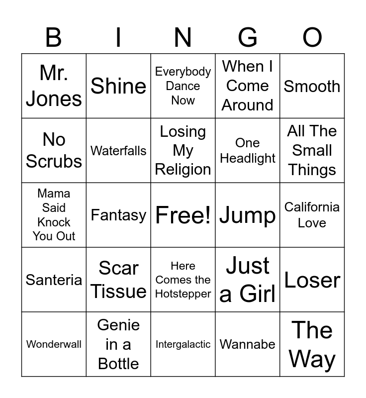 This bingo card has a free space and 40 words: Santa Monica, Mama Said Knock You Out, Baby One More Time, Waterfalls, Genie in a Bottle, Here Comes the Hotstepper, Losing My Religion, The Boy is Mine, Smooth, Santeria, Fantasy, When I Come Around, The Way, California Love, Jump, Scar Tissue, Everyday is a Winding Road, Mr. Jones, Smells Like Teen Spirit, Everybody Dance Now, Loser, Wannabe, One Headlight, No Scrubs, MMMBop, Jump Around, Semi-Charmed Life, Say My Name, Whatta Man, Tubthumping, Glycerine, Wonderwall, Hold On, Just a Girl, All The Small Things, Intergalactic, No Diggity, All Star, Shine and Come as You Are.