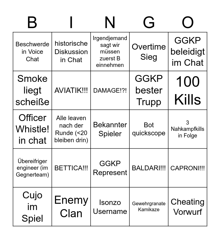 This bingo card has a free space and 24 words: BETTICA!!!, Enemy Clan, DAMAGE!?!, Cujo im Spiel, GGKP beleidigt im Chat, Beschwerde in Voice Chat, Smoke liegt scheiße, historische Diskussion in Chat, Bot quickscope, GGKP Represent, GGKP bester Trupp, Officer Whistle! in chat, BALDARI!!!, CAPRONI!!!, AVIATIK!!!, Gewehrgranate Kamikaze, 3 Nahkampfkills in Folge, Irgendjemand sagt wir müssen zuerst B einnehmen, 100 Kills, Alle leaven nach der Runde (<20 bleiben drin), Cheating Vorwurf, Übereifriger engineer (im Gegnerteam), Overtime Sieg and Isonzo Username.