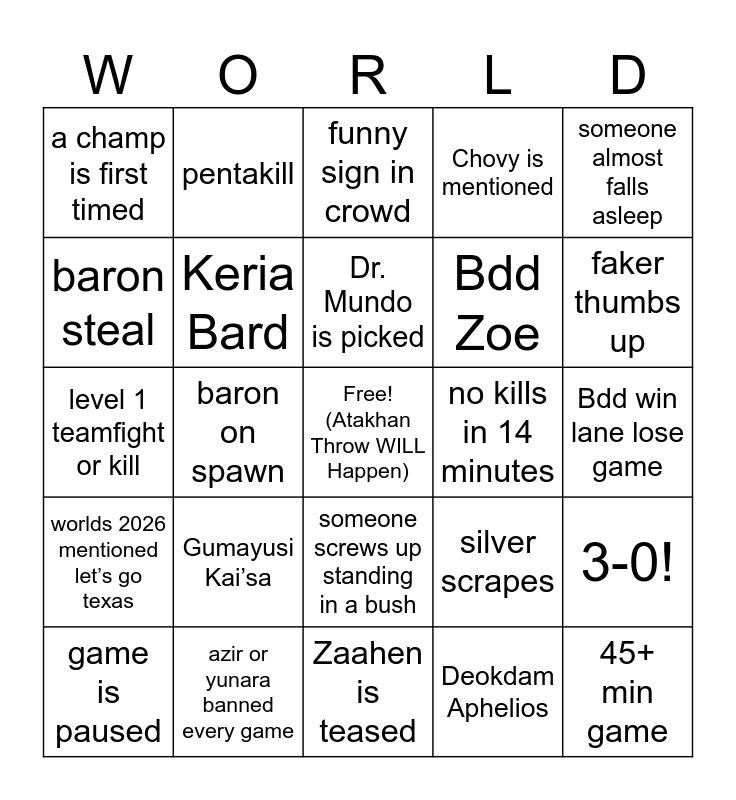 This bingo card has a free space and 24 words: Gumayusi Kai’sa, azir or yunara banned every game, Dr. Mundo is picked, game is paused, someone almost falls asleep, a champ is first timed, baron steal, pentakill, no kills in 14 minutes, someone screws up standing in a bush, Bdd Zoe, level 1 teamfight or kill, silver scrapes, 3-0!, Keria Bard, Deokdam Aphelios, Bdd win lane lose game, funny sign in crowd, faker thumbs up, baron on spawn, 45+ min game, worlds 2026 mentioned let’s go texas, Chovy is mentioned and Zaahen is teased.