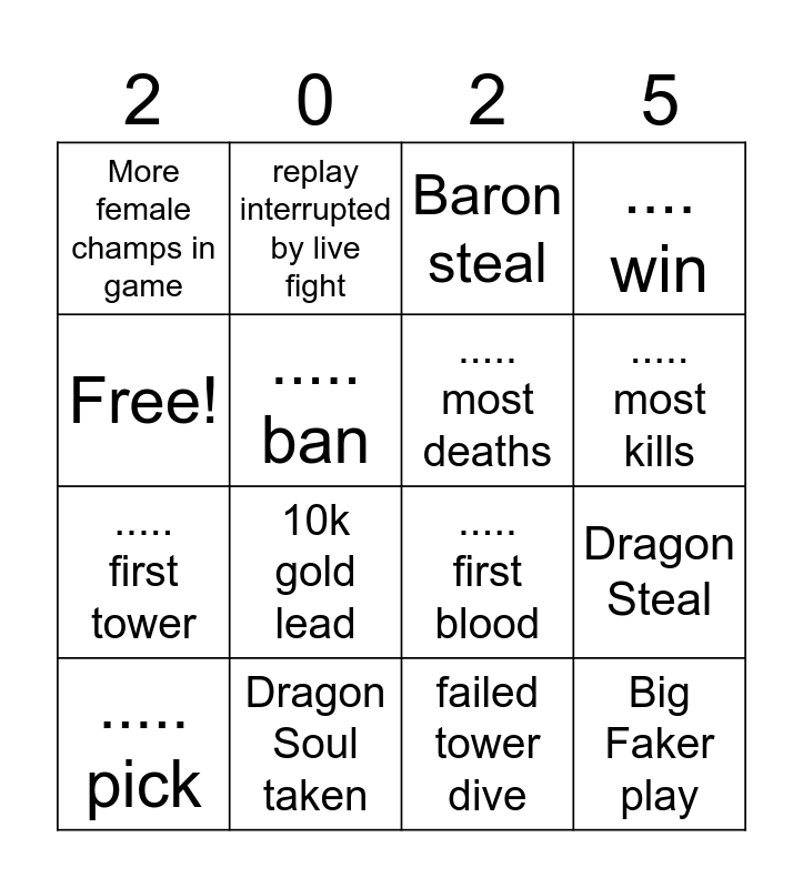 This bingo card has 16 words: Dragon Soul taken, Dragon Steal, Baron steal, More female champs in game, ..... first tower, replay interrupted by live fight, ..... first blood, failed tower dive, Free!, ..... ban, ..... pick, .... win, 10k gold lead, ..... most kills, ..... most deaths and Big Faker play.