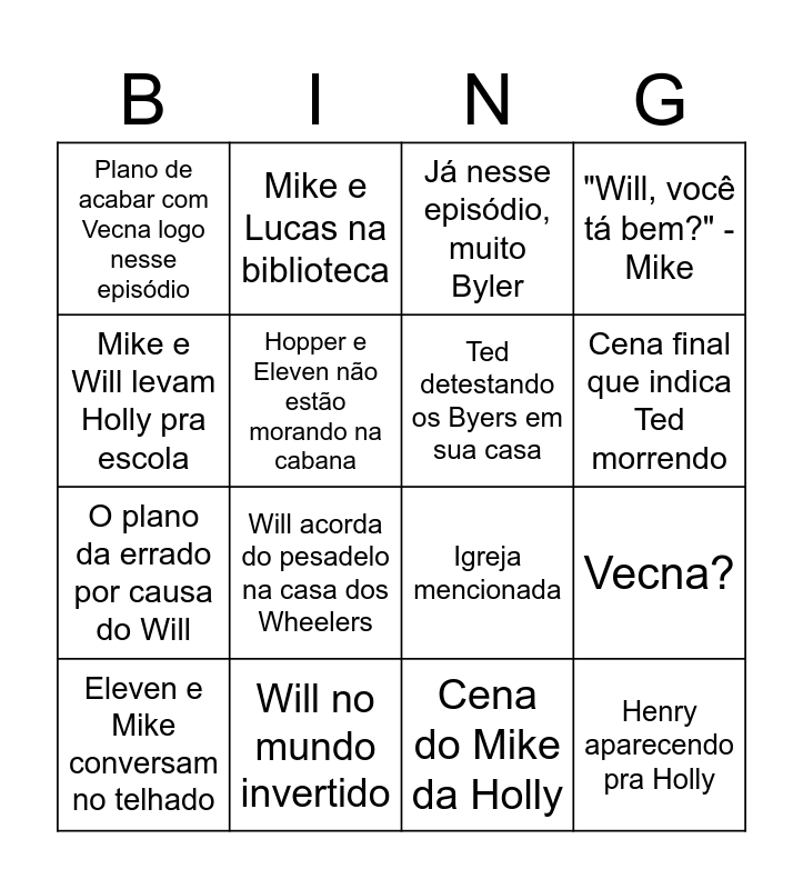 This bingo card has 16 words: Will no mundo invertido, Vecna?, Já nesse episódio, muito Byler, Plano de acabar com Vecna logo nesse episódio, O plano da errado por causa do Will, Mike e Lucas na biblioteca, Igreja mencionada, Cena do Mike da Holly, Mike e Will levam Holly pra escola, Hopper e Eleven não estão morando na cabana, Eleven e Mike conversam no telhado, "Will, você tá bem?" - Mike, Will acorda do pesadelo na casa dos Wheelers, Cena final que indica Ted morrendo, Ted detestando os Byers em sua casa and Henry aparecendo pra Holly.