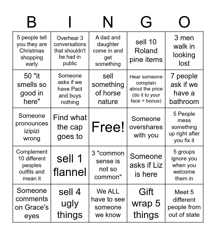 This bingo card has a free space and 24 words: sell 1 flannel, sell 4 ugly things, sell something of horse nature, Someone comments on Grace's eyes, 3 men walk in looking lost, 5 people tell you they are Christmas shopping early, 50 "it smells so good in here", Overhear 3 conversations that shouldn't be had in public, Someone overshares with you, 3 "common sense is not so common", Hear someone complain about the price (do it to your face = bonus), Someone pronounces izipizi wrong, Someone asks if Liz is here, 5 groups ignore you when you welcome them in, Someone asks if we have Pact and buys nothing, Gift wrap 5 things, 5 People mess something up right after you fix it, A dad and daughter come in and get something, 7 people ask if we have a bathroom, Find what the cap goes to, Meet 5 different people from out of state, Complement 10 different peoples outfits and mean it, sell 10 Roland pine items and We ALL have to see someone we know.
